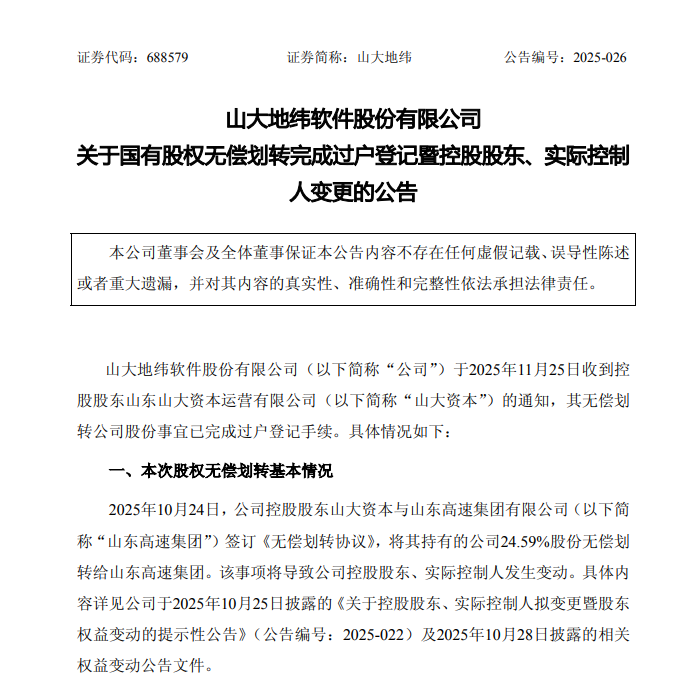 2025年4月,鸥玛软件和山大地纬首次披露山东大学正在筹划深化校属企业体制改革事宜,可能导致实际控制权变动。10月24日,两家公司同步发布实控人变更公告。根据公告,两家公司的控股股东山大资本分别与山东国投、山东高速集团签署《无偿划转协议》。筹划已久的改革方案正式落地。
