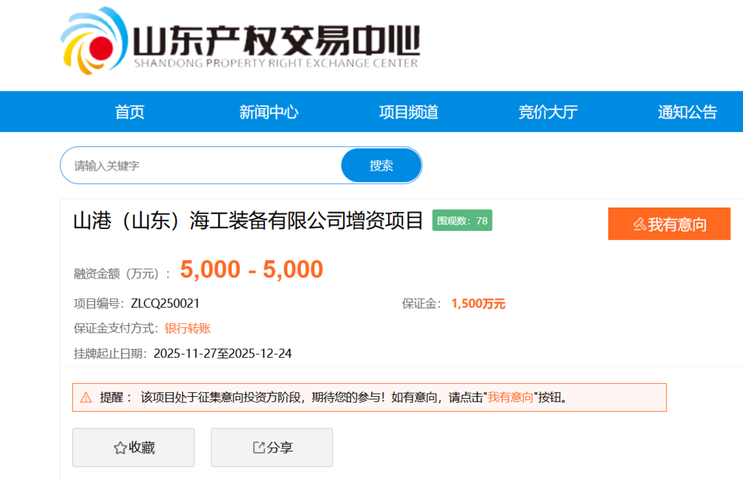 11月27日,山港(山东)海工装备有限公司(下称“山港海工”)增资项目在山东产权交易中心挂牌。