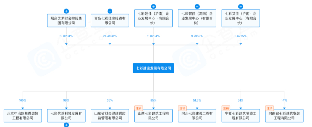 股权穿透显示,七彩建设股东为烟台芝罘财金控股集团(持股51.02%)、青岛七彩佳涂投资有限公司(24.49%)、七彩翊佳(济南)企业发展中心(有限合伙)(11.02%)、七彩智佳(济南)企业发展中心(有限合伙)(9.80%)、七彩艾佳(济南)企业发展中心(有限合伙)(3.67%)。