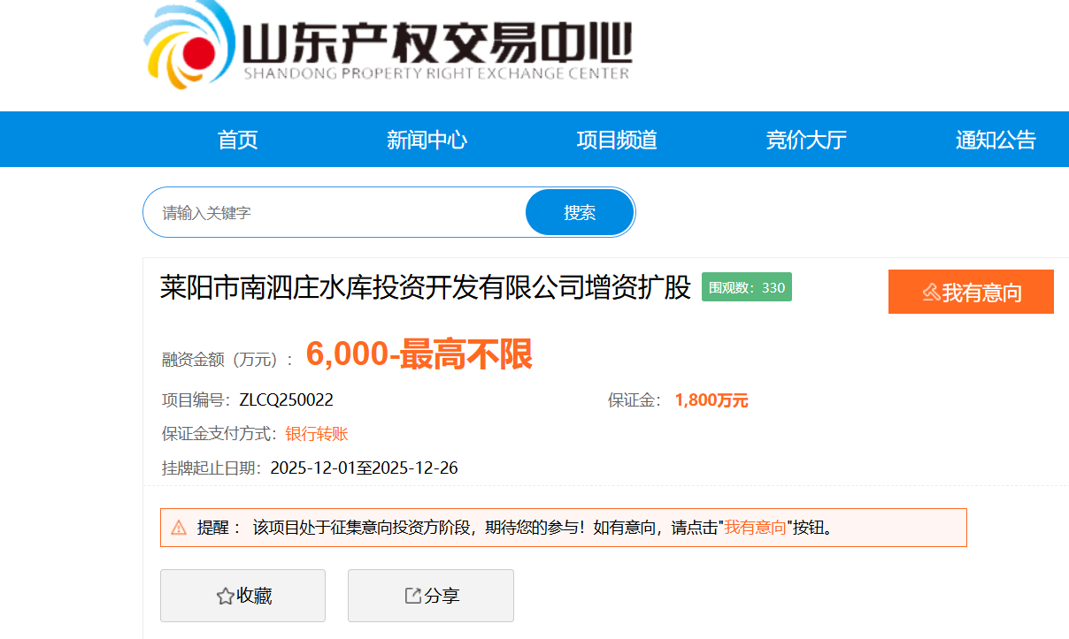 12月1日,莱阳市南泗庄水库投资开发有限公司(下称“南泗庄水库投资”)增资扩股项目在山东产权交易中心挂牌,融资金额不低于6000万元。