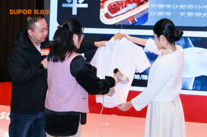 产品展示环节成为整场发布会的高光时刻。苏泊尔以“产品串烧首发+沉浸式演示互动”的创新形式,全方位展现品牌在研发创新与市场竞争力上的硬核实力。全新亮相的吸附式挂烫机系列,凭借独特设计与实用性能收获全场赞誉;