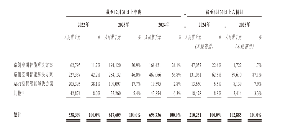 分业务来看,报告期内,智慧互通的收入主要来自路侧空间智能解决方案,其营收占比分别为42.2%、46%、66.8%和87.1%,持续上升。同期,AIoT空间智能解决方案营收占比从38.1%降至7.9%。