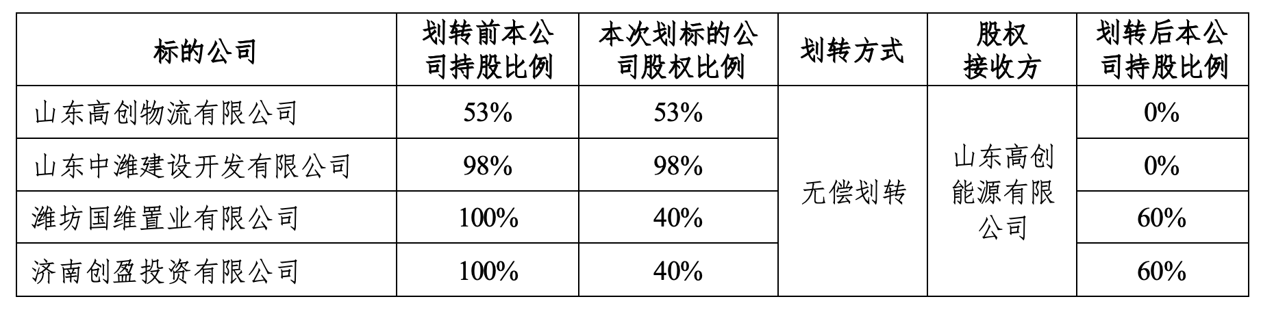 公告披露,高创建投集团将持有的山东高创物流有限公司53%股权、山东中潍建设开发有限公司98%股权、潍坊国维置业有限公司40%股权、济南创盈投资有限公司40%股权、山东高创医疗科技有限公司40%股权及潍坊尚合经贸有限公司40%股权划转至高创能源。此举意在优化国有资产布局,整合市场化经营主体及相关业务、资源。