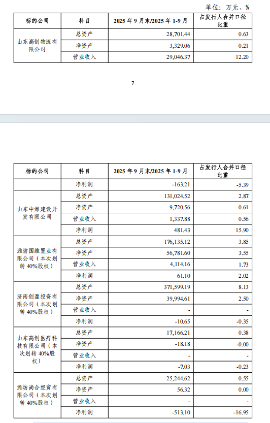 山东高创物流有限公司成立于2016年2月,注册资本2000万元。山东中潍建设开发有限公司成立于2021年12月,注册资本1亿元,济南创盈投资有限公司成立于2016年11月,注册资本4亿元,山东高创医疗科技有限公司成立于2023年11月,注册资本5000万元,潍坊尚合经贸有限公司成立于2020年8月,注册资本866万元,企查查信息显示,这5家公司股权已于11月28日划转完成。
