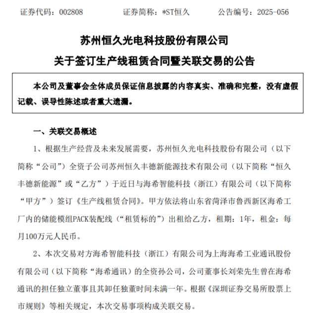 10月24日,海希通讯同意全资孙公司海希浙江将其位于山东省菏泽市鲁西新区海希工厂内的储能模组PACK装配线出租给恒久丰德。同日,双方签署了《生产线租赁合同》,租赁期限为12个月,租金为每月100万元(含税)。但截至12月8日,恒久丰德未支付任何租金,海希浙江依据合同条款行使解除权,已送达《解除函》。