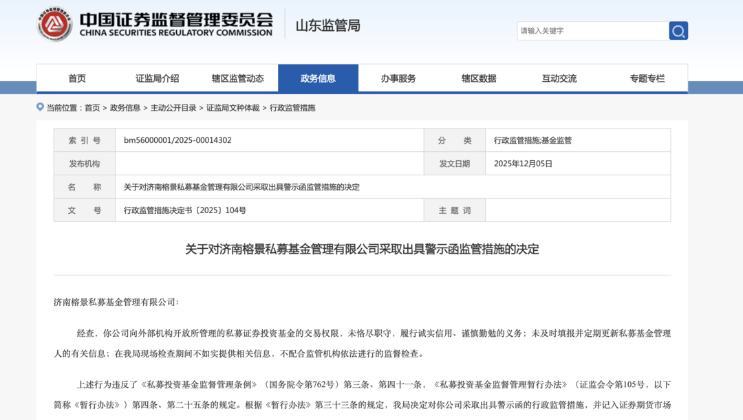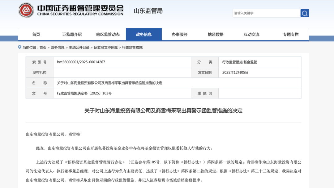 12月5日,山东证监局对山东海量投资有限公司及其负责人商雪梅、济南榕景私募基金管理有限公司及其负责人尹柳斯和基金经理李昱昕采取出具警示函监管措施。