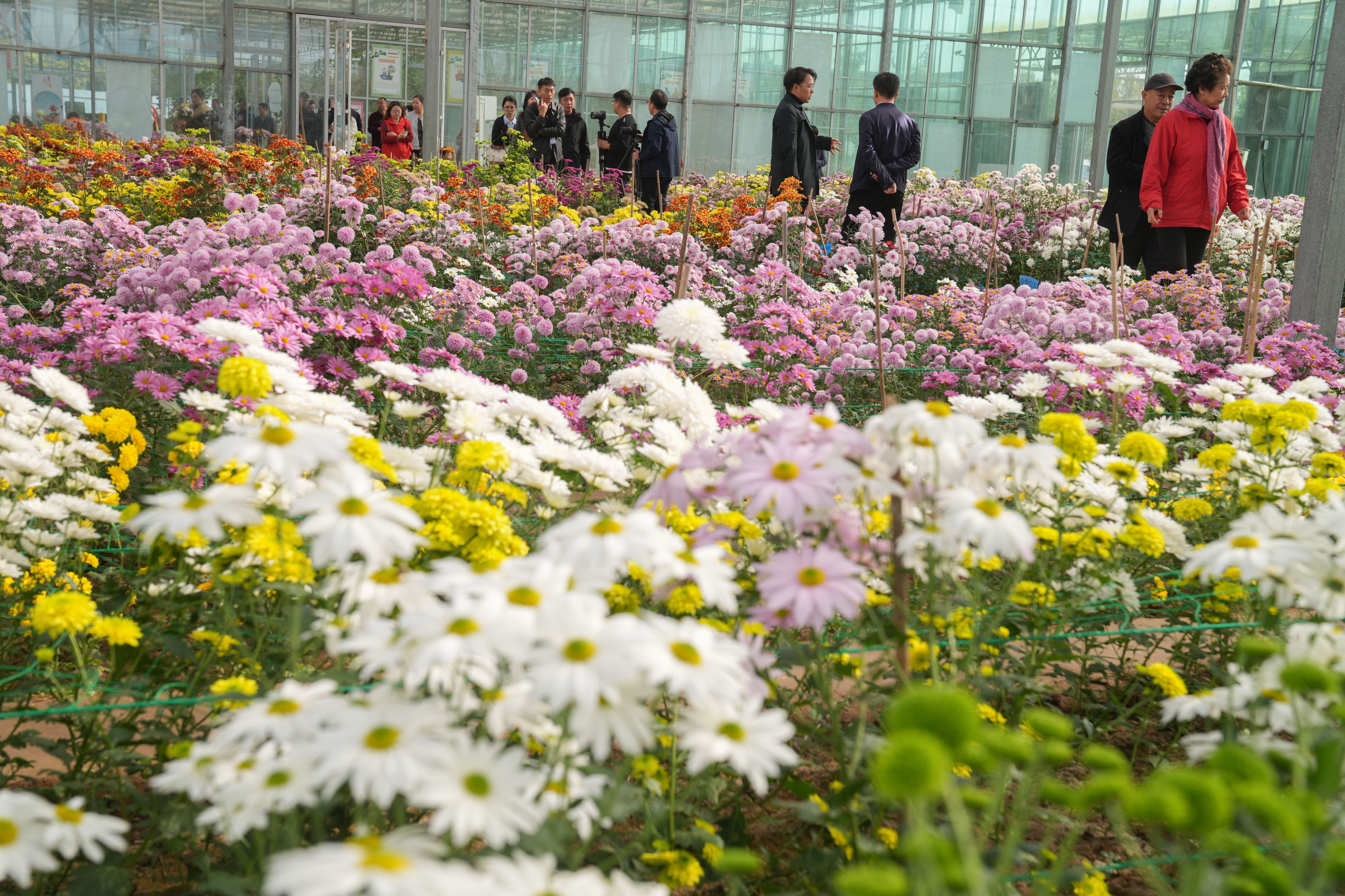 深秋时节,长山镇八方生态家庭农场的菊花大棚内,花开正艳,游客们寻花而来,或在花田赏花打卡,或驻足品上一杯金丝皇菊茶,还有不少游客放慢脚步,等待中午品尝鲜菊花水饺的美味。