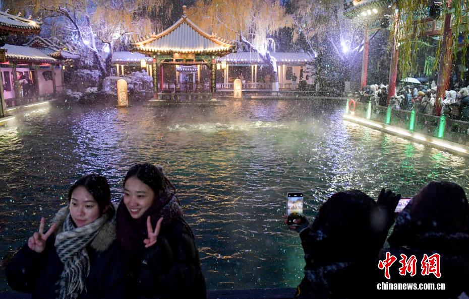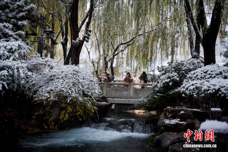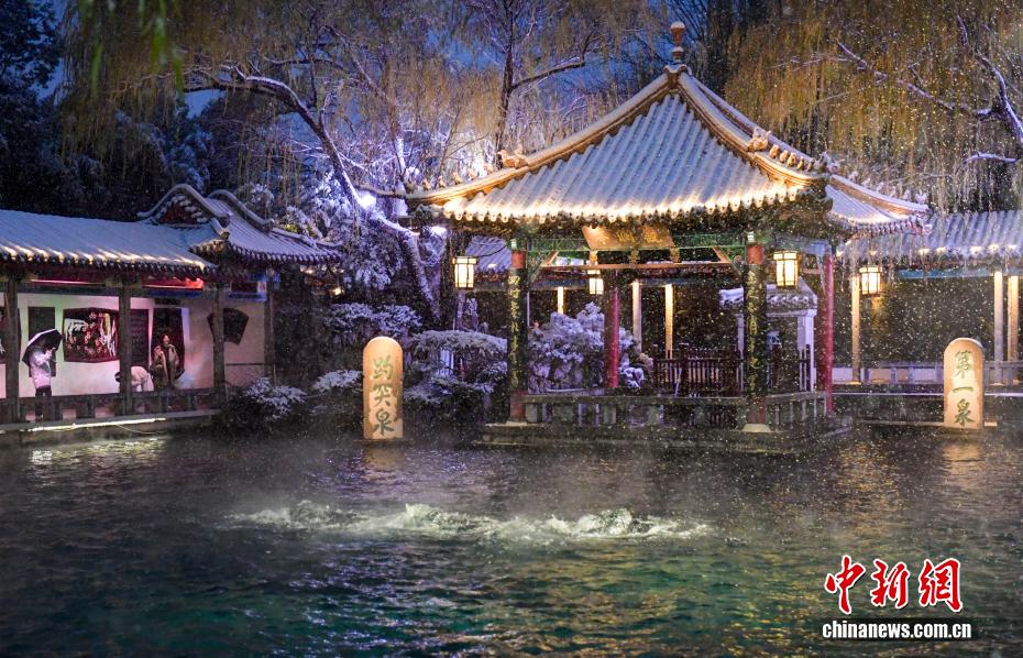 12月12日,游客在济南趵突泉公园里赏雪观泉。当日,山东济南迎来2025年入冬以来首场降雪,济南趵突泉公园里白雪皑皑,美不胜收。 中新社记者 张勇 摄