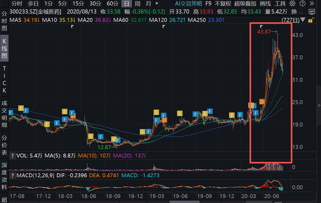 金城医药2011年6月在创业板上市,发行价18.6元 / 股,其股价最高点出现在2015年6月,盘中曾最高触及119.65元。