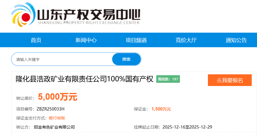 其中,招金有色矿业有限公司持有的隆化县浩政矿业有限责任公司(下称“隆化县浩政矿业”)100%国有产权,转让底价5000万元。