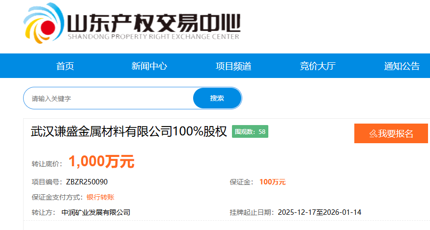 同日,招金集团旗下另一公司中润矿业发展有限公司持有的武汉谦盛金属材料有限公司100%股权,也在山东产权交易中心挂牌转让,转让底价1000万元。