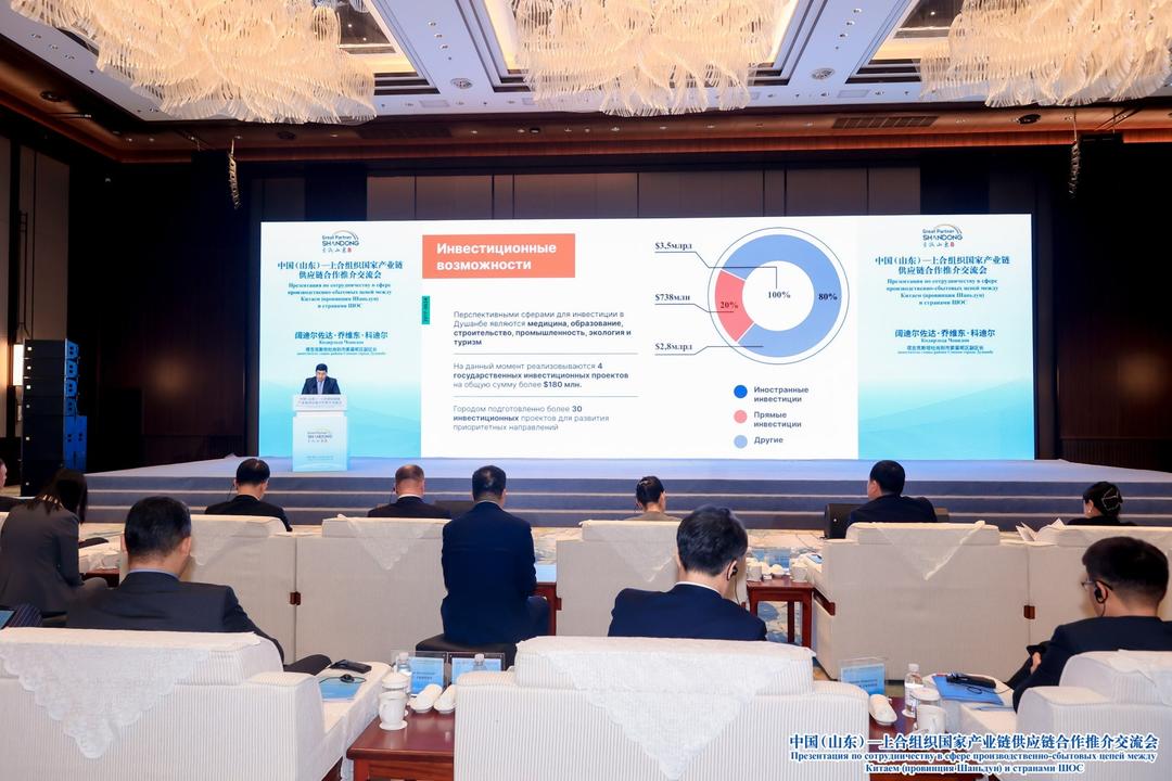 在中国(山东)—上合组织国家产业链供应链合作推介交流会的开幕式上,上海合作组织副秘书长戴思泽作视频致辞,商务部欧亚司、商务部及驻青岛特派员办事处相关负责人到会指导出席会议,山东省商务厅党组书记、厅长王磊,青岛市、上合示范区相关领导出席活动并致辞。白俄罗斯、哈萨克斯坦、吉尔吉斯斯坦、俄罗斯、塔吉克斯坦、乌兹别克斯坦等上合组织国家省州市经贸部门、园区、重点企业代表,国内相关省市商务部门、园区、重点企业代表约290人参加活动。