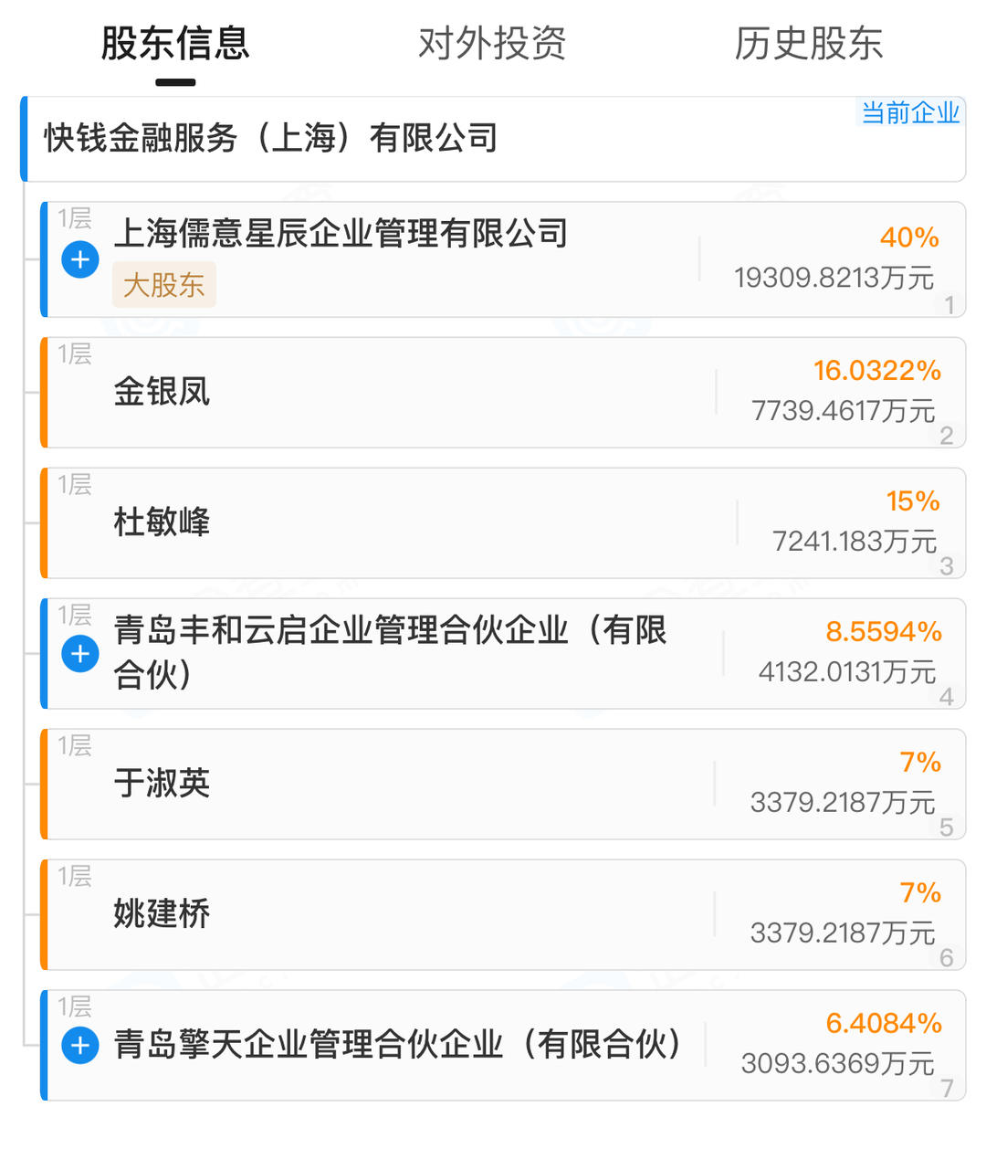 截至目前,快钱金融共有7名股东。除了上海儒意星辰企业管理有限公司持股40%之外,股东行列还包括金银凤、杜敏峰、青岛丰和云启企业管理合伙企业(有限合伙)、青岛擎天企业管理合伙企业(有限合伙)、姚建桥、于淑英。