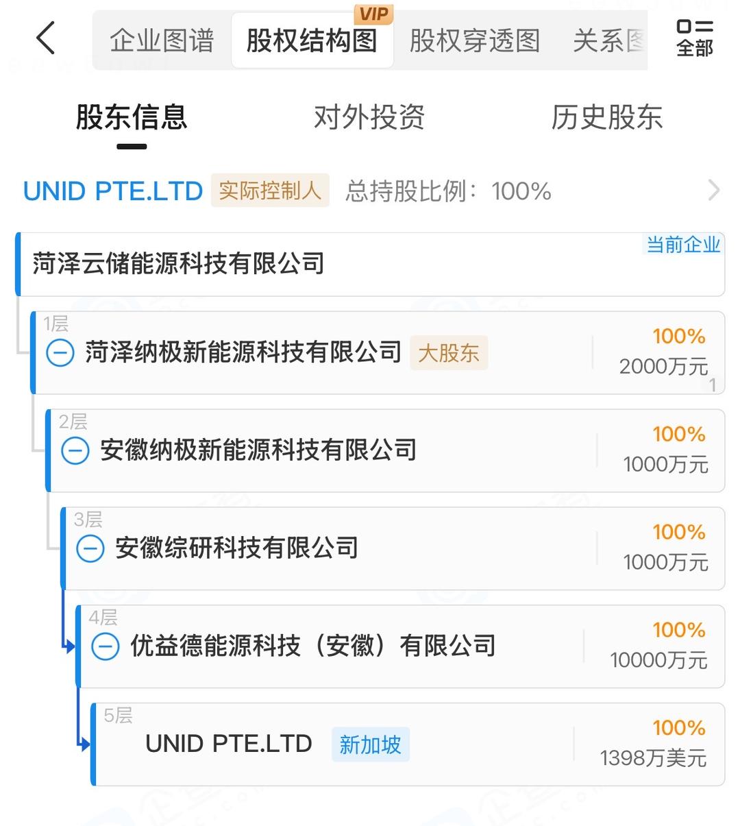 企查查信息显示,菏泽云储能源科技有限公司成立于2023年4月,注册资本2000万元,法定代表人陈荣华,系菏泽纳极新能源科技有限公司全资子公司,实控人为新加坡企业UNID PTE.LTD.