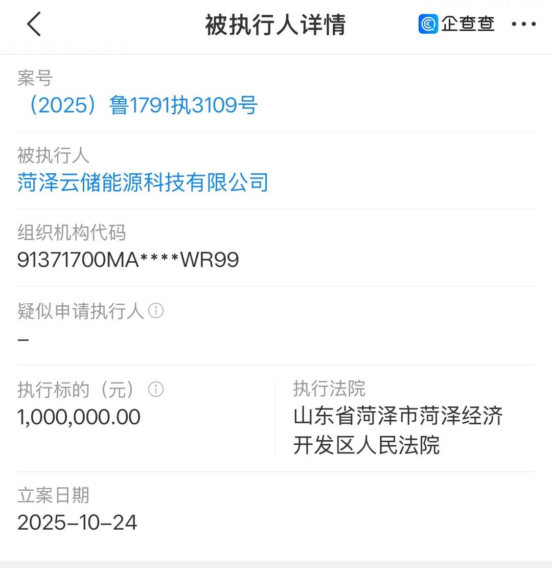 不过,菏泽云储能源科技有限公司今年10月24日被菏泽市菏泽经济开发区人民法院列为被执行人,执行标的100万元。