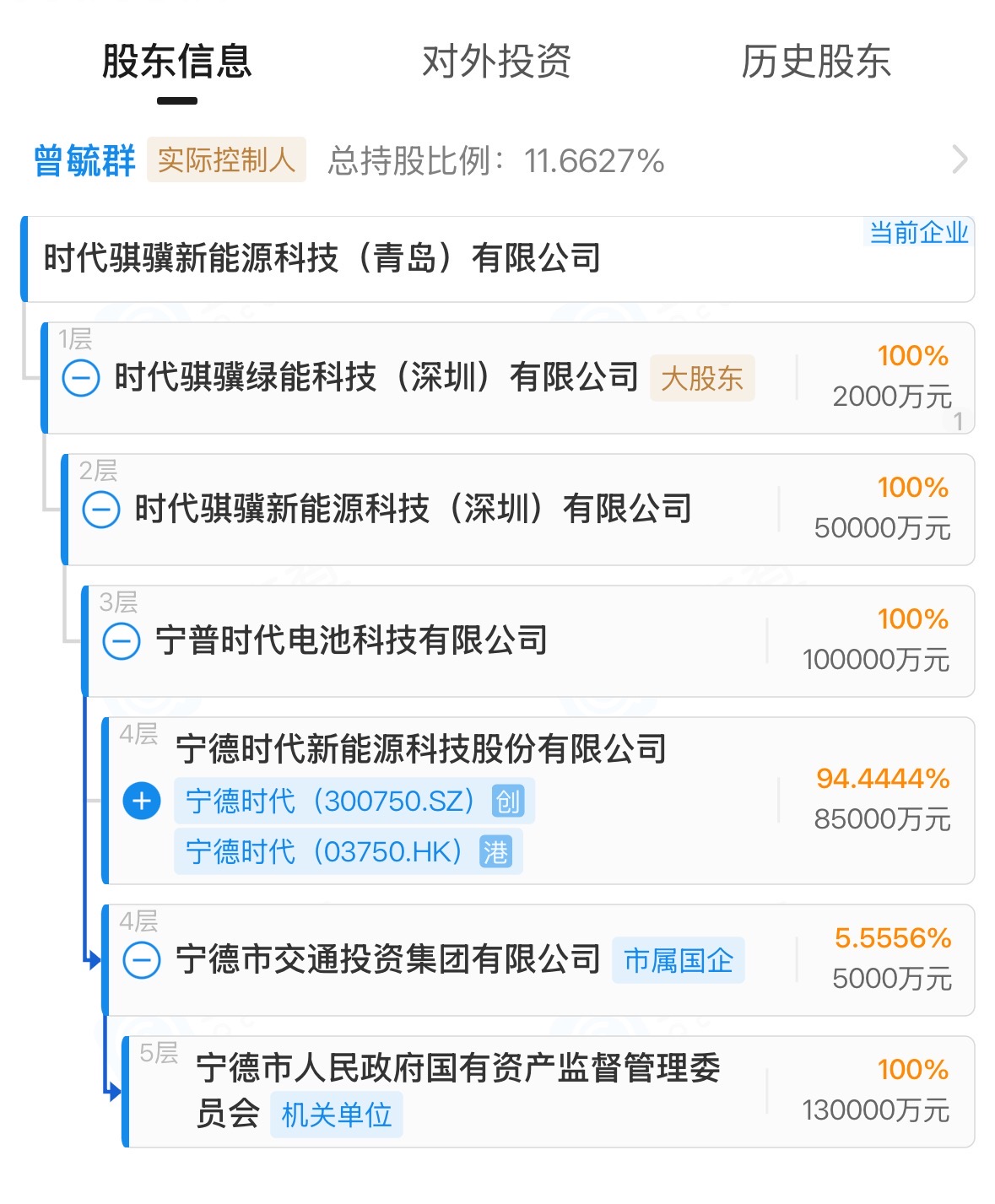 企查查显示,12月18日,西海岸时代骐骥新能源科技(青岛)有限公司在青岛市黄岛区成立,注册资本500万元,经营范围包括新兴能源技术研发、新能源汽车换电设施销售、在线能源计量技术研发、新能源汽车整车销售等。股权穿透显示,该公司由宁德时代旗下时代骐骥新能源科技(青岛)有限公司全资持股,最终实控人为宁德时代董事长兼总经理曾毓群。