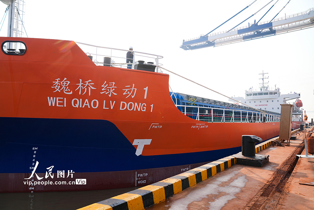 “魏桥绿动1”货轮作为首艘新能源散货船,整合8个集装箱式锂电池组,采用并联油电混合驱动技术,主要用于铝矾土、铁矿、煤炭等散装货物的运输,降低传统航运碳排放,实现近海港口区域“零排放”,助力绿色航运发展。董乃德摄(人民图片网)