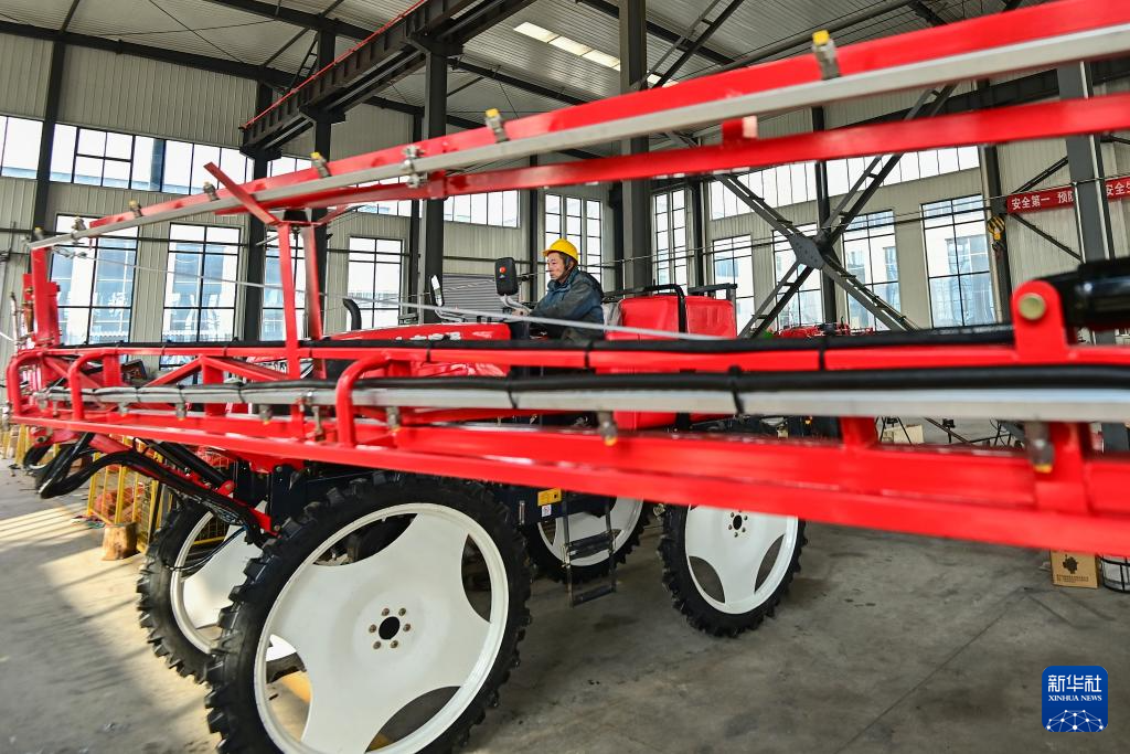 2月20日,在山东省青州经济开发区一家农业机械制造企业,工人调试大型宽幅喷杆喷药机。
