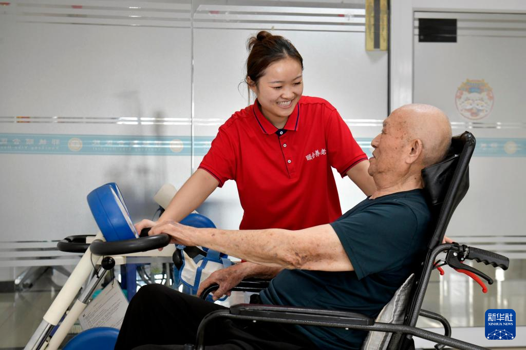 8月20日,在山东省郓城颐合养老服务中心,参保职工长护险的苑丹月在工作人员陪护下做康复训练。