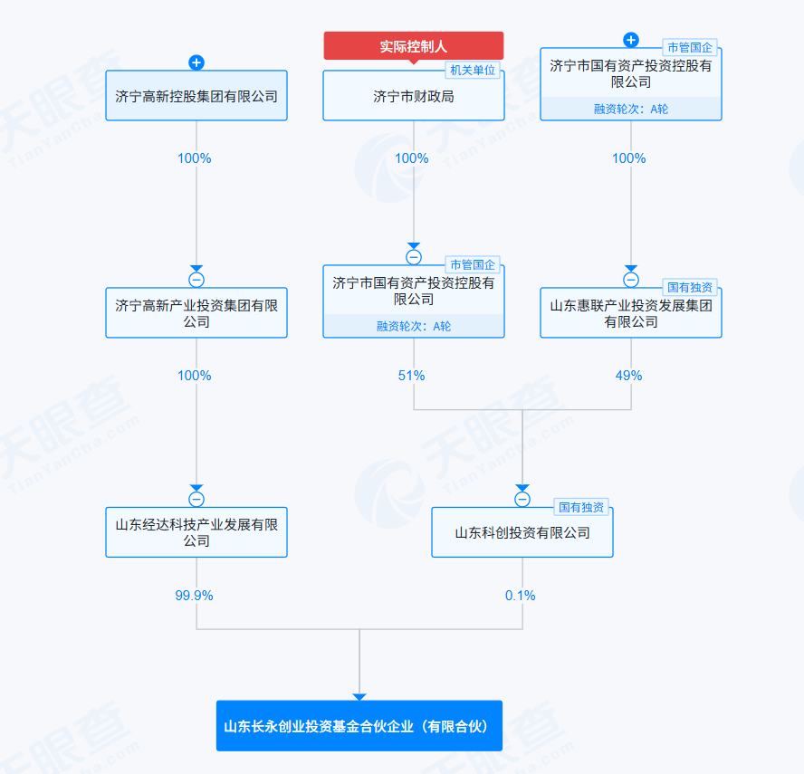 从股权结构图看,济宁高新产业投资集团有限公司持有山东经达科技产业发展有限公司100%股权;济宁市国有资产投资控股有限公司持有山东科创投资有限公司51%的股权,山东惠联产业投资发展集团有限公司持有山东科创投资有限公司49%的股权。而济宁市国有资产投资控股有限公司100%持有山东惠联产业投资发展集团有限公司的股权,济宁市财政局100%控股济宁市国有资产投资控股有限公司。