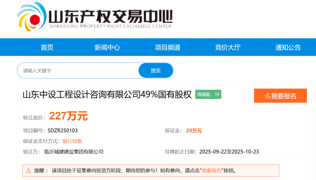 9月22日,山东中设工程设计咨询有限公司(下称“山东中设”)49%国有股权在山东产权交易所挂牌转让,转让底价227万元,转让方为临沂城建建设集团有限公司(下称“临沂城建建设集团”)。