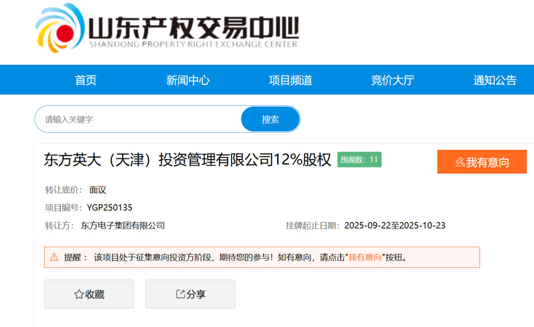 9月22日,山东省产权交易中心预披露了东方英大(天津)投资管理有限公司(下称“东方英大”)12%股权转让的项目,转让方为东方电子集团有限公司(下称“东方电子集团”)。