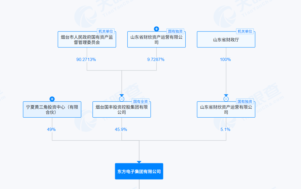 从股权穿透图看,宁夏黄三角投资中心(有限合伙)持有东方电子集团49%的股权,山东省财欣资产运营有限公司持有5.1%的股权,烟台国丰投资控股集团有限公司持有45.9%的股权。而烟台市人民政府国有资产监督管理委员会持有烟台国丰投资控股集团有限公司90.27%的股权,山东省财欣资产运营有限公司持有剩余的9.73%的股权。