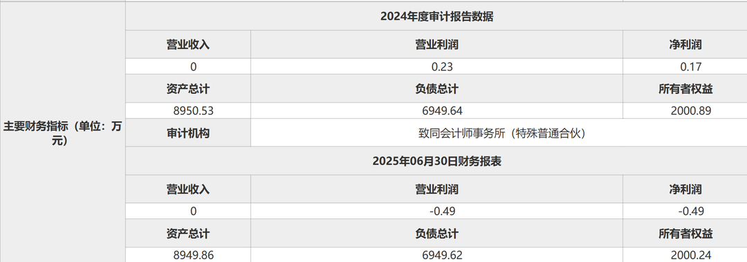 财务数据方面,2024年度,天柱材料实现营业收入0元,实现净利润0.17万元;截至2025年6月30日,该公司实现营业收入0元,实现净利润-0.49万元,资产总额为8949.86万元,所有者权益为2000.24万元。
