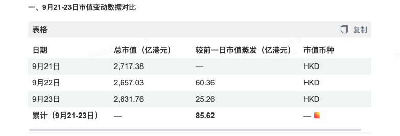始祖鸟风波背后,其运营公司大股东安踏体育,是绕不过去的关联方。受此次事件影响,9月22日,安踏体育开盘即下跌超4%,收盘仍跌2.22%报94.65港元/股,单日市值蒸发60.36亿港元;次日(9月23日)继续下跌0.95%收报93.75港元/股,两日累计蒸发85.62亿港元。