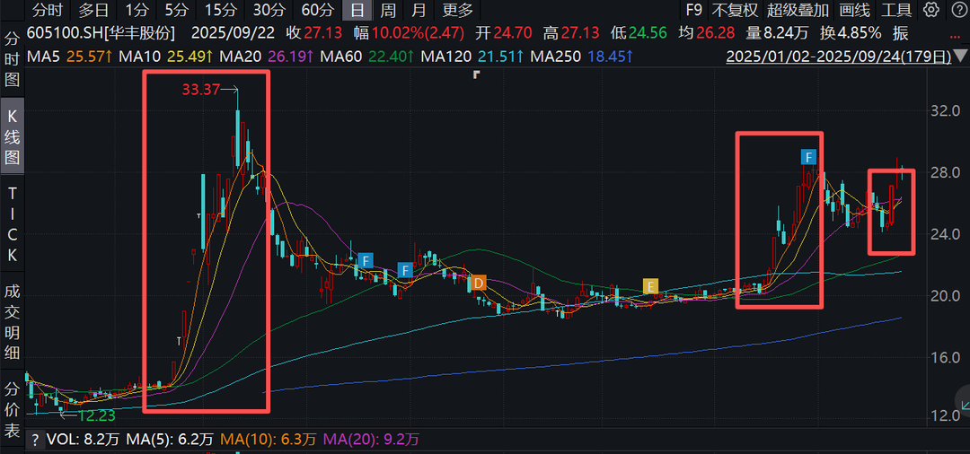 9月22日,华丰股份(605100.SH)“10cm”涨停,截至收盘,报收27.13元/股,全天换手率4.85%,成交量8.24万手。23日,该股继续上涨,截至收盘,涨幅为3.58%,报收28.1元/股。