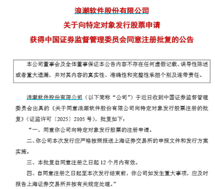 9月24日,信息技术龙头企业浪潮软件(600756.SH)发布公告称,向特定对象发行股票的申请已获得中国证券监督管理委员会同意注册批复,自同意注册之日起12个月内有效。