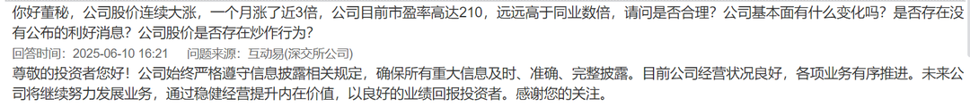 针对股价暴涨、市盈率高等问题,有投资者在询问公司股价是否存在炒作行为,对此,联合化学表示:“公司始终严格遵守信息披露相关规定,确保所有重大信息及时、准确、完整披露。目前公司经营状况良好,各项业务有序推进。”