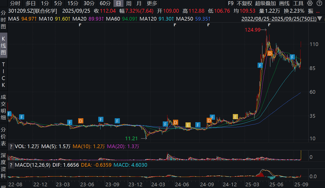 2022年8月创业板上市的联合化学发行价为14.95 元,上市首日盘中最高价为48.75元,此后,股价在10元至30元左右波动。今年,其股价开启了飙涨模式,5月23日,该股盘中触及历史最高价124.99元,较年初低点25.01元大涨400%,不过之后4个月,其股价未能继续上涨,股价滑至百元以下。
