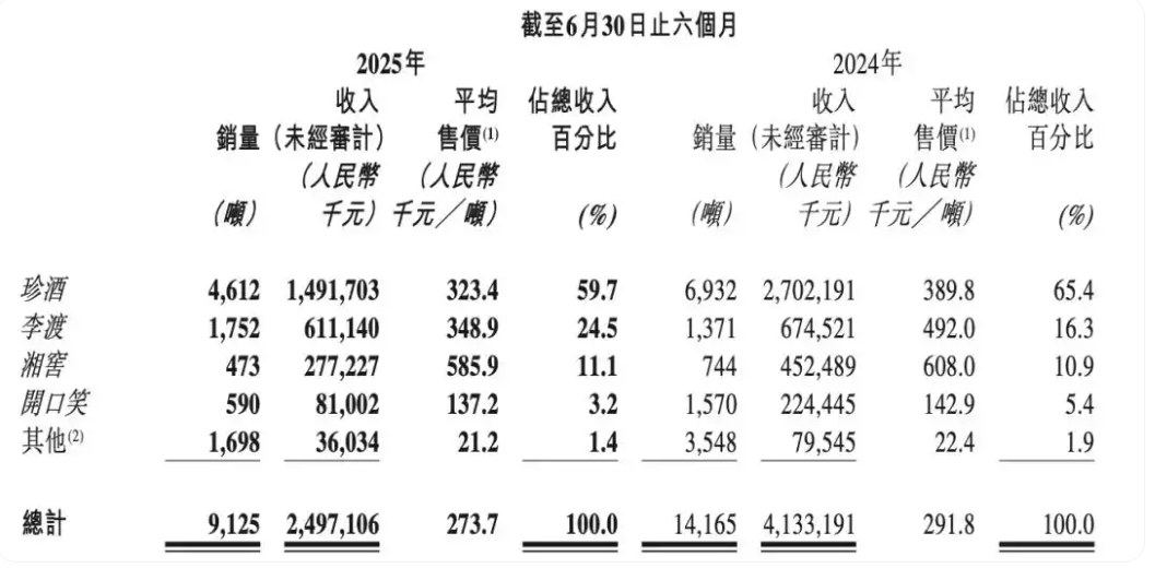 作为核心支柱的珍酒品牌上半年实现营收14.92亿元,与去年同期的27亿元相比减少44.8%;销量由去年同期的6932吨下滑至4612吨,平均售价也由38.98万元/吨下滑至32.34万元/吨;在内部营收占比下滑至不到60%。