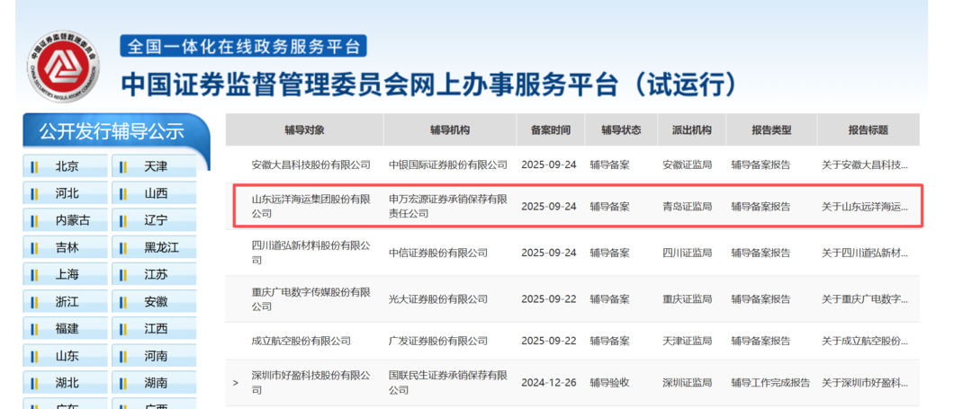 据证监会网站披露,山东远洋海运集团股份有限公司(下称“山东远洋”)于9月24日在青岛证监局进行上市辅导备案登记,拟首次公开发行股票并上市,辅导券商为申万宏源证券承销保荐有限责任公司(下称“申万宏源证券”)。