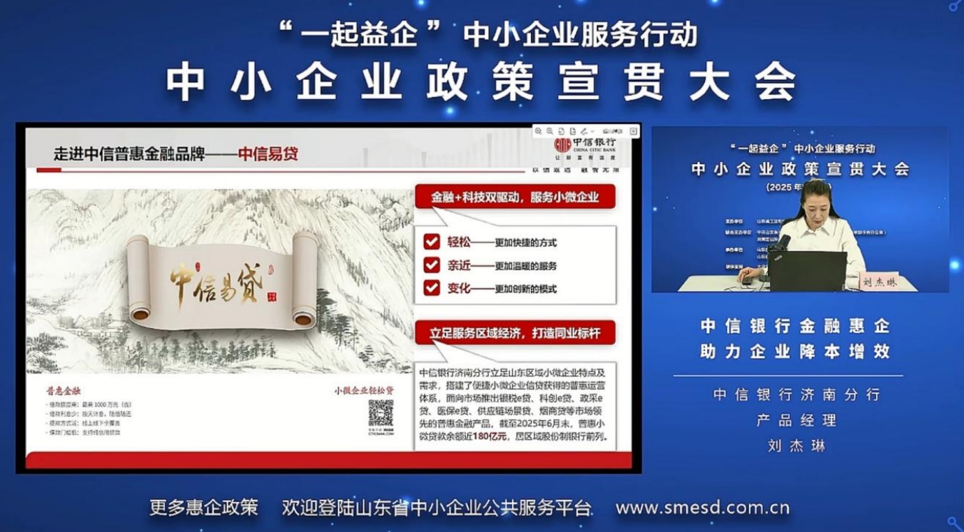 9月4日,中信银行济南分行受邀参加由山东省中小企业公共服务平台举办的“一起益企”中小企业服务政策宣贯大会,向600多家中小企业宣讲惠企政策。 会议由山东省工业和信息化厅主办、山东省普惠中小企业公共服务中心承办,邀请山东省金融监督管理局、中信银行济南分行和永赢金租等单位交流发言,让企业“知、懂、用、享”惠企政策。 中信银行济南分行主要讲解了为解决中小企业融资难题推出的“中信易贷”系列产品——纯信用方式、全流程线上支持科技企业融资需求的“科创e贷”、服务政府采购项目供应商的“政采e贷”、适用于供应链上下游企业的“票据e贷”,为几乎所有经营场景的小微企业都提供了适配方案,同时结合真实案例为参会企业现场答疑,“流程简、期限活、利率低、放款快”的优势,让不少企业眼前一亮。