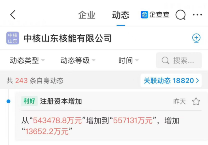企查查显示,近日,中核山东核能有限公司(下称“中核山东核能公司”)发生工商变更,注册资本从54.35亿元增加到55.71亿元。