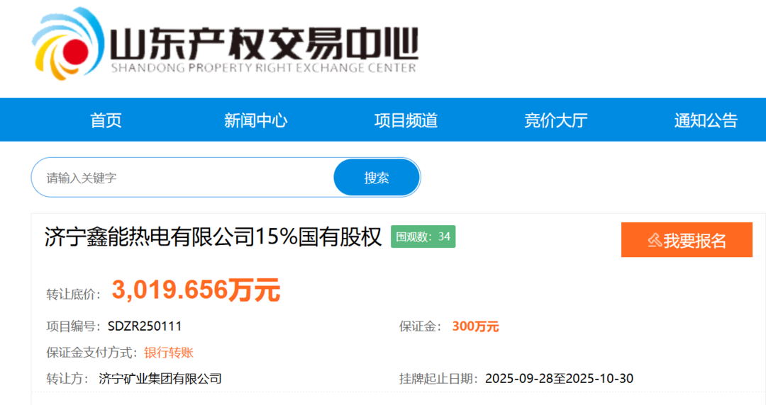9月28日,济宁鑫能热电有限公司(下称“鑫能热电”)部分国有股权在山东省产权交易中心挂牌交易,转让底价3019.66万元,转让方为济宁矿业集团有限公司(下称“济宁矿业”)。济宁矿业共持有53.33%的股权,此次转让的数量为15%。