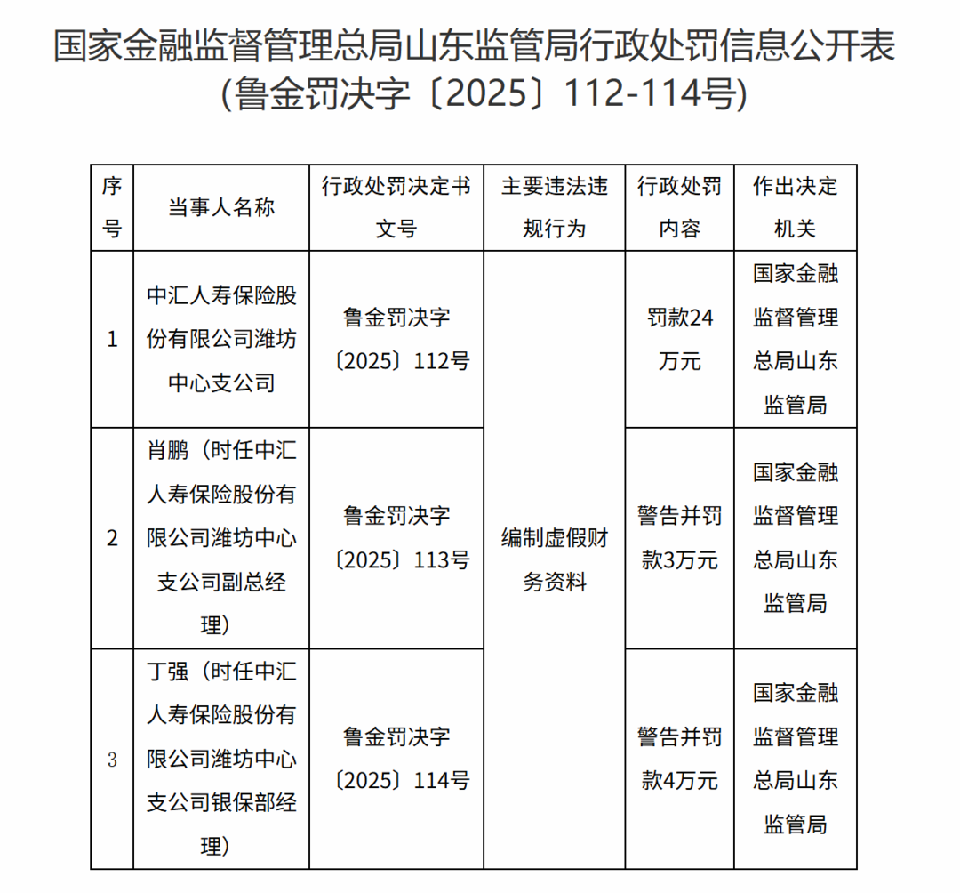 行政处罚决定书显示,中汇人寿潍坊中心支公司存在编制虚假财务资料的违法行为。该公司被处以24万元罚款,处罚决定由国家金融监督管理总局山东监管局于2025年作出。同时,两名相关责任人也受到处罚。时任副总经理肖鹏被警告并罚款3万元,时任银保部经理丁强被警告并罚款4万元。