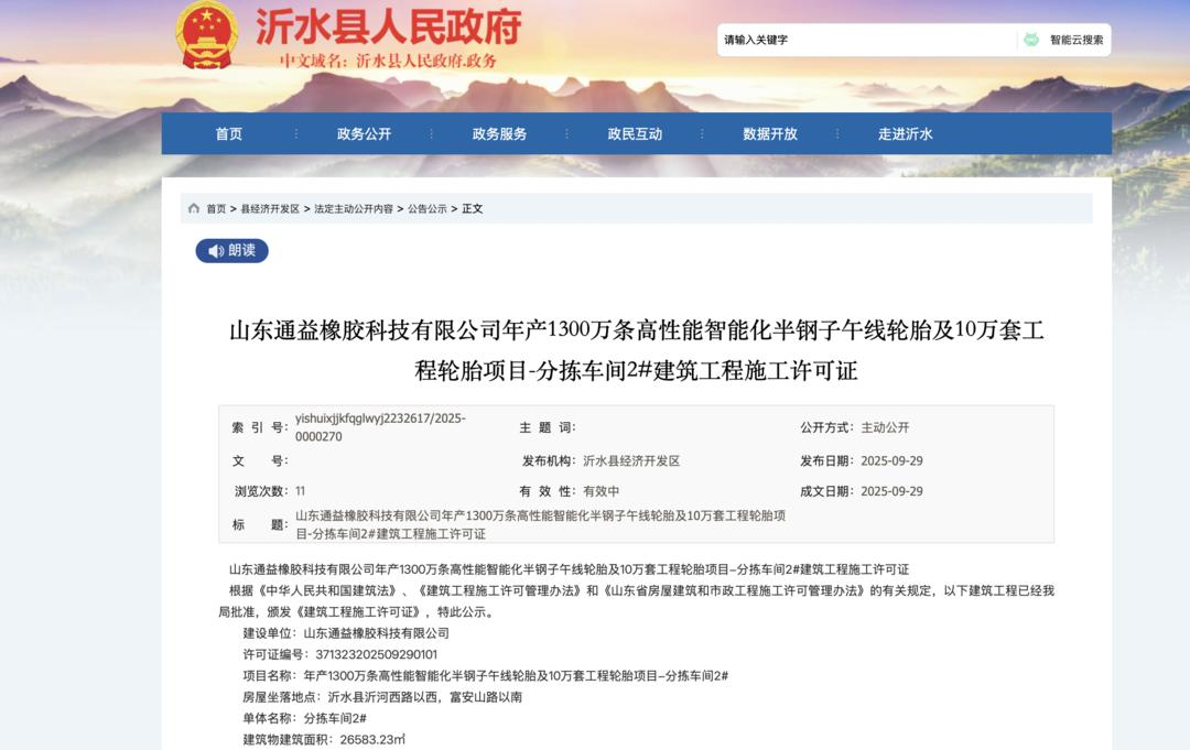 9月29日,临沂市沂水县政府公布了“山东通益橡胶科技有限公司年产1300万条高性能智能化半钢子午线轮胎及10万套工程轮胎项目-分拣车间2#建筑工程施工许可证”,这也意味着该项目进入施工建设关键期。