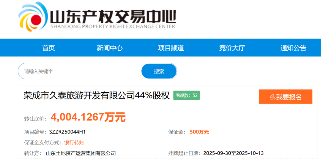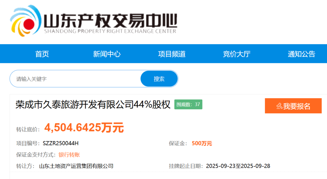 9月30日,山东土地资产运营集团有限公司(下城“山东土地资产”)再次挂牌转让其持有的荣成市久泰旅游开发有限公司(下称“久泰旅游”)44%股权,转让底价4004.13万元。