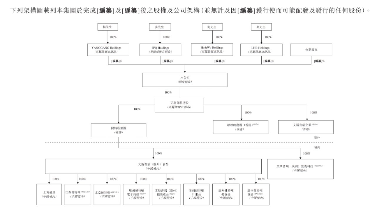 招股书显示,公司主要股东通过YANGGANG Holdings、JFQ Holdings等境外实体间接控制股权,公司运营主体为艾斯普瑞(广州)食品有限公司,其100%股权由健特唯集团有限公司(香港)持有,而健特唯集团有限公司系上述境外控股平台体系下的境内运营载体。