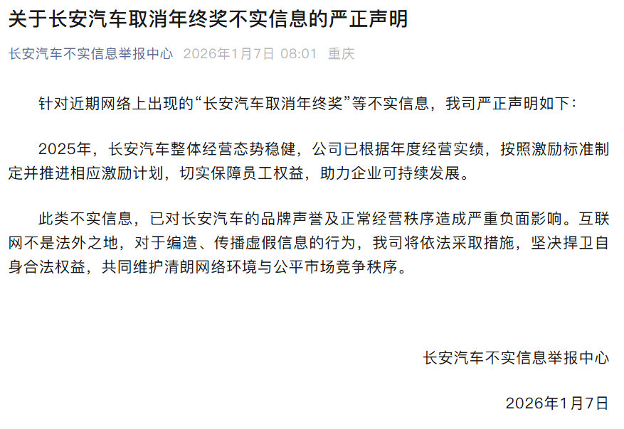 1月7日,中国长安汽车集团有限公司(以下简称“长安汽车”)通过官方“不实信息举报中心”微信公众号发布严正声明,明确否认网络流传的“取消2025年度年终奖”传闻,称相关说法与事实不符。公司强调,2025年整体经营态势稳健,已依据年度经营实绩,按照既定激励标准制定并推进相应激励计划,切实保障员工合法权益,助力企业可持续发展。