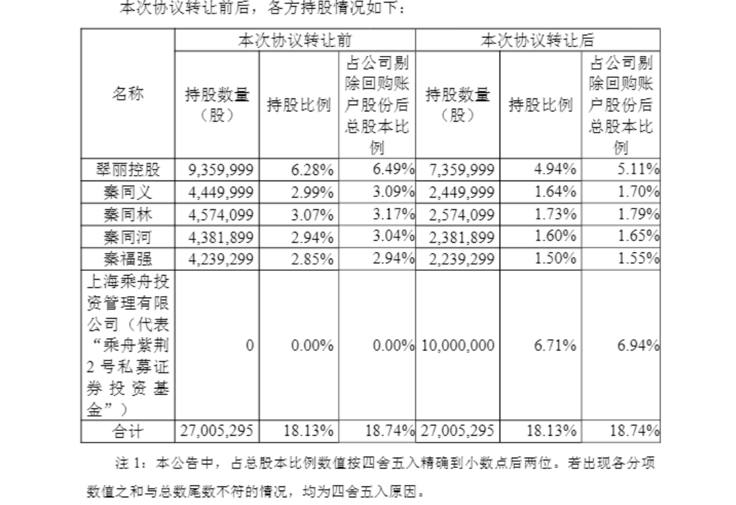 具体而言,本次协议转让前,翠丽控股持有联诚精密936万股(占公司总股本的6.28%),秦同义、秦同林、秦同河、秦福强分别持有445万股(占公司总股本的2.99%)、457.41万股(占公司总股本的3.07%)、438.19万股(占公司总股本的2.94%)、423.93万股(占公司总股本的2.85%)。本次转让后,上述转让方持股数量将相应减少,而受让方乘舟投资将持有公司6.71%股份。