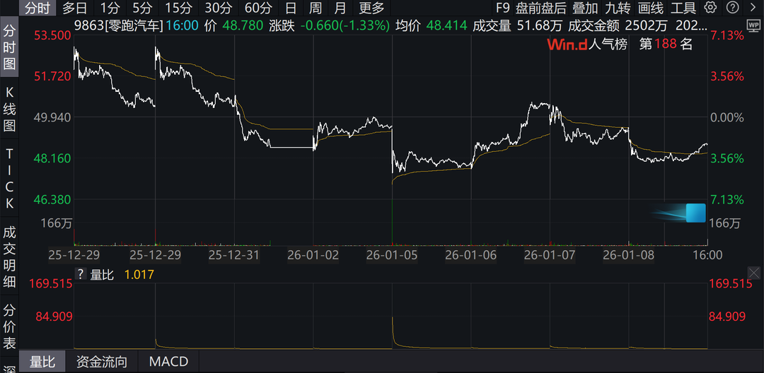 2026年1月6日,零跑汽车股价开盘报48.00港元,受金义高新认购消息的影响,盘中最高触及50.65港元,最终收于50.50港元,较前一交易日收盘价47.88港元上涨5.47%,不过成交量较前一交易日下降 13.3%。在此后的两个交易日内,零跑汽车股价连续小幅下行,累计跌幅达3.4%,市值从718亿港元回落至693.56亿港元。