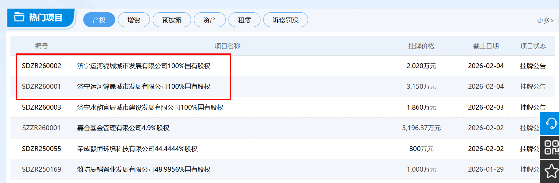 1月8日,济宁运河置地有限公司(下称“运河置地”)将其旗下济宁运河锦晟城市发展有限公司(下称“运河锦晟”)及济宁运河锦城城市发展有限公司(下称“运河锦城”)100%国有股权在山东产权交易中心挂牌转让。