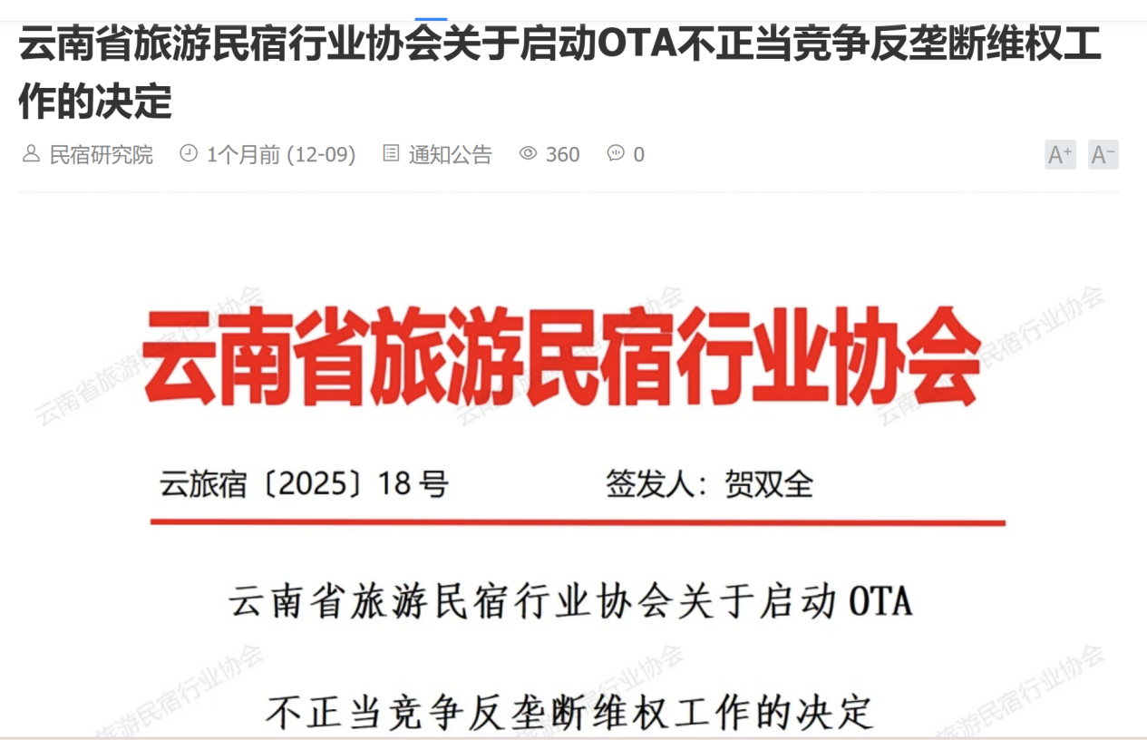 2025年11月21日,云南省旅游民宿行业协会发布《关于启动OTA不正当竞争反垄断维权工作的决定》。该文件称,近年来,协会接到多个会员单位投诉,反映携程等个别OTA平台利用其市场支配地位,对云南民宿行业实施了包括但不限于“二选一”霸王条款、单方面随意涨佣、设置不公平交易条件、屏蔽流量等不正当竞争行为。据协会会长贺双全透露,协会已和法务对接确认了相关事实并掌握部分关键证据,正推进集体维权工作。据了解,该协会由云南省文化和旅游厅与云南省商务厅共同指导成立,目前拥有近7000家酒店民宿会员。