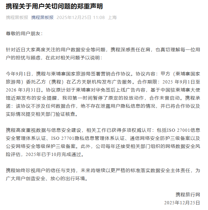 面对舆论压力,携程于2025年12月25日发布声明,称“协议未曾启动,且不涉及任何数据合作”,并强调公司已通过ISO 27001、ISO 27701等多项国际信息安全认证,且2025年10月已完成国家网络数据安全风险评估。然而,这份声明并未完全打消公众的疑虑。