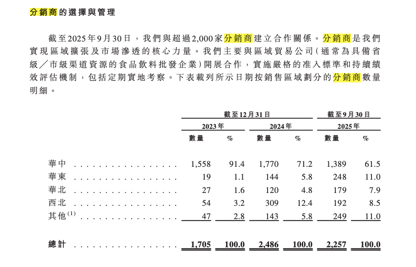 招股书显示,2023年、2024年及2025年三季度末,公司的分销商数量分别为1705家、2486家、2257家。其中,截至2025年三季度末,华中地区分销商数量为1389家,占比61.5%,此外,华东地区248家、华北地区179家、西北地区192家、其他地区249家。