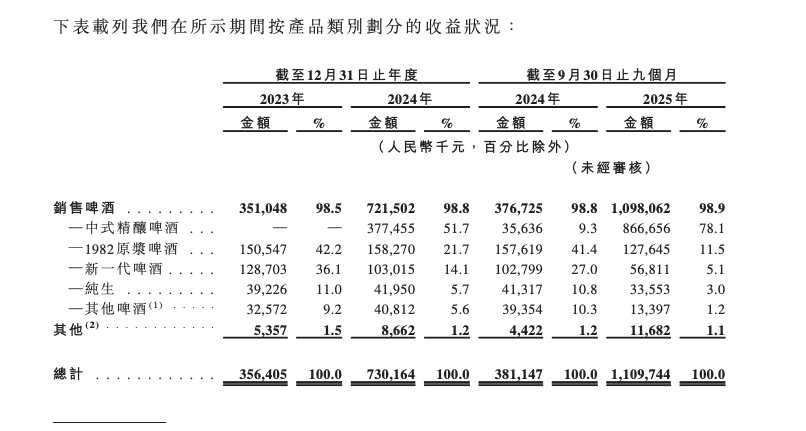招股书显示,金星啤酒中式精酿啤酒容量均为1L/罐,售价均为20元/罐。2025年前9个月,中式精酿啤酒贡献了金星啤酒78.1%的收入,成为公司业绩增长的核心驱动力。